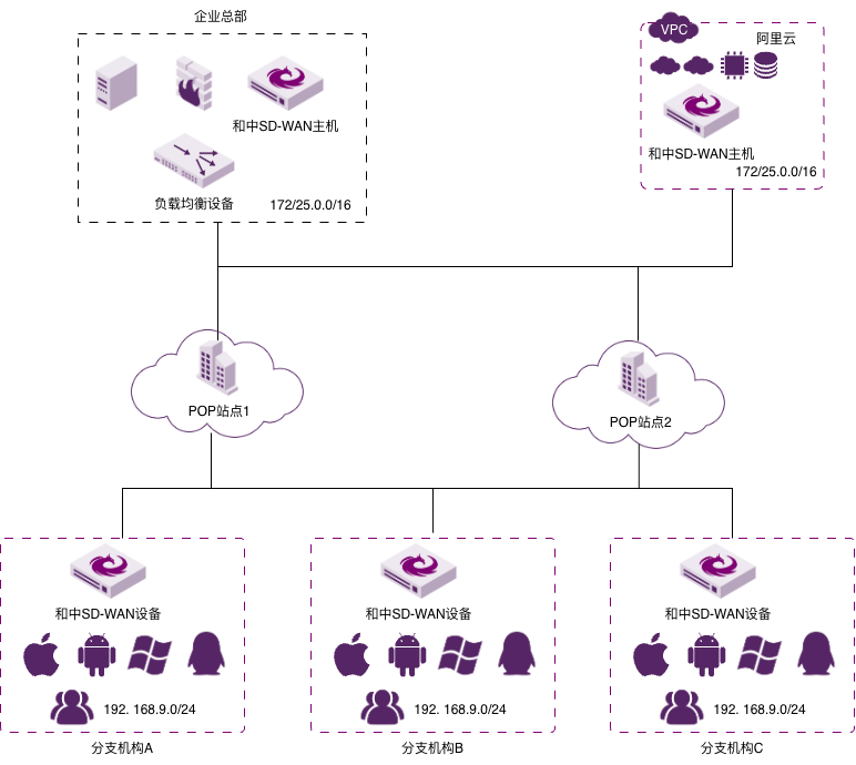 采用云POP网络架构,在公有云VPC,本地数据中心,分支机构间搭建虚拟专网,实现全网资源的互通,打造一张企业安全互联网络。