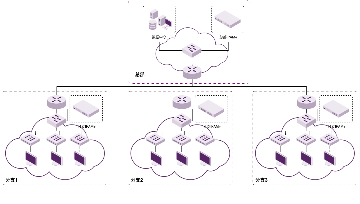单台设备"All in One",融合管理和多个业务功能角色(DNS/DHCP等),安装维护简单,可部署多台实现高可用,适用于中小型规模企业。