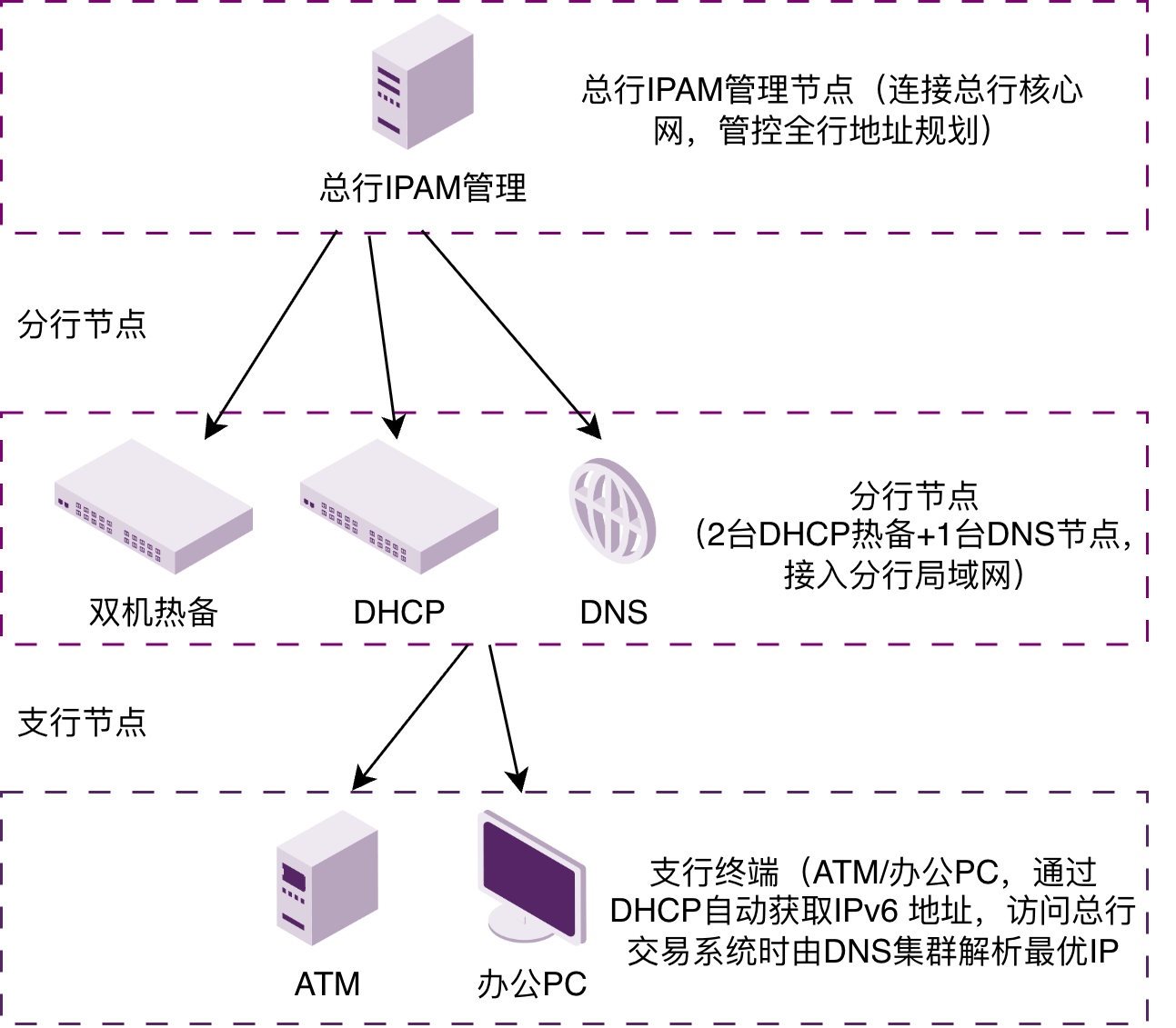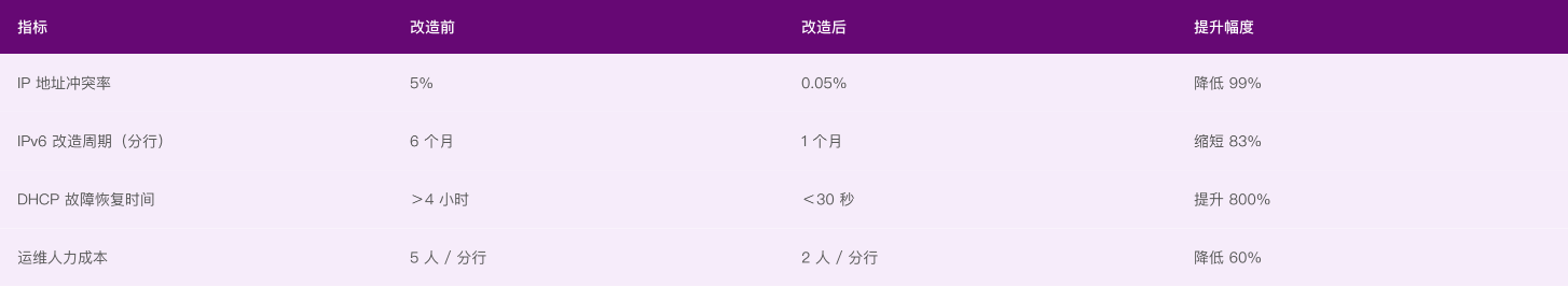 金融机构需完成总行 - 分行 - 支行三级网络 IPv6 改造,核心诉求包括:保障交易系统 IP 地址零冲突(避免业务中断);缩短 IPv6 改造周期(符合监管要求);实现跨区域 IP 资产统一管控(总行监管分支)。 需求痛点:传统 Excel 管理 IP,地址冲突率高达 5%,曾导致某支行 ATM 交易中断 2 小时;人工规划 IPv6 子网,分行改造周期平均 6 个月,远超监管 “3 个月完成” 要求; 分支 DHCP 服务器独立运行,故障时无热备,业务恢复时间>4 小时。解决方案:采用 “分布式部署 + 双栈高可用” 架构,核心配置如下: 总行部署 1 套 IPAM 管理节点,统一管控全行 IPv6 地址规划(语义化建模:按 “总行-分行-业务类型” 定义地址规则,如 “FD00:0000::/32 - 总行核心区 - 交易业务”); 各分行部署 2 台 DHCP 节点(双机热备),支持 DHCPv6-PD 前缀委派,自动为支行分配子网; 部署 DNS 集群(3 节点),支持 A/AAAA 记录联动,跨运营商解析时延<50ms。