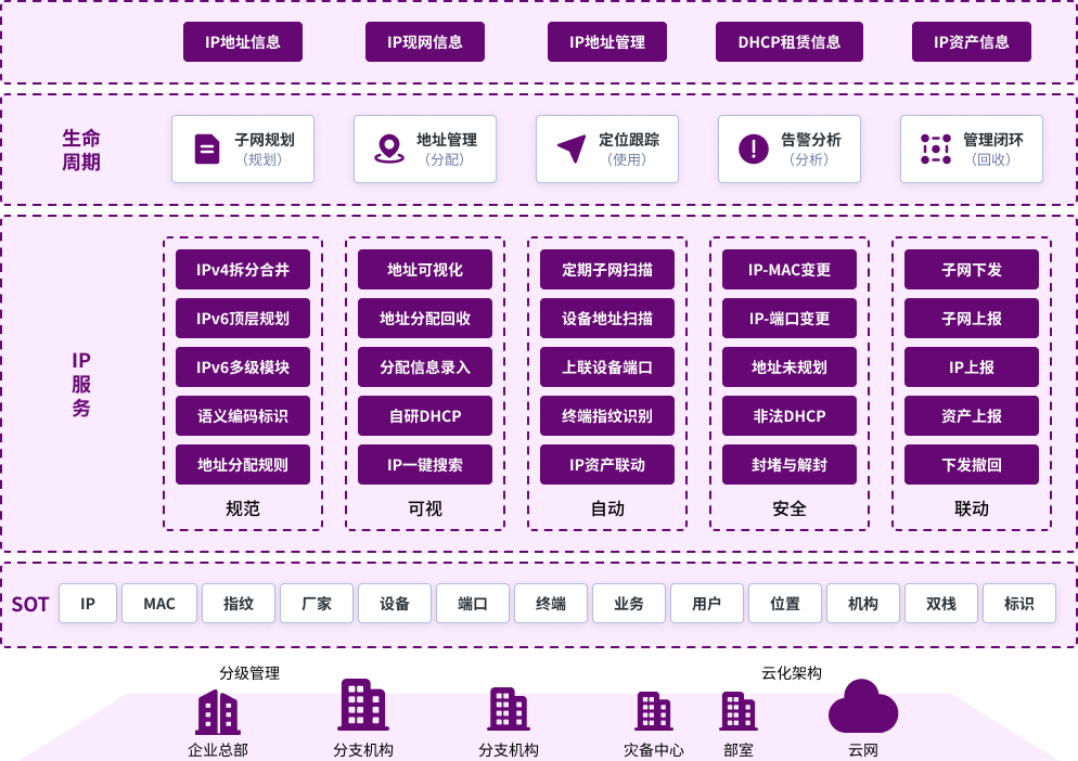 DDI是和中科技自主研发的"DNS(域名解析)+DHCP(动态地址分配)+IPAM(IP地址管理)"一体化解决方案,基于容器化架构与单一可信数据源(SoT),实现混合IT环境下IP资产的全生命周期管理、动态地址服务与安全域名解析。系统打破传统DDI组件独立部署的局限,通过数据联动构建"规划-分配-解析-监控-回收"闭环,同时支持IPv4/IPv6双栈,为各行业提供合规、稳定、高效的IP基础设施支撑。