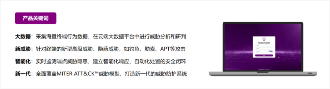 产品采用典型的C/S架构,管理后台负责接收终端Agent采集的数据并进行威胁分析研判、下达处置策略和指令,采集的数据在云端进行数据清洗、分析后,管理员可对威胁进行快速响应遏制,形成终端免疫效果,并下发到管理的终端,形成完整的事件处置闭环。