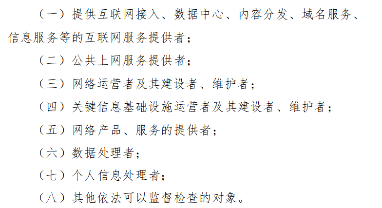 旧版本的监督对象集中于“互联网服务提供者”,如接入服务、信息服务、公共上网服务等4个主体,对数据处理、网络产品运营等环节存在监管空白;新版本则将范围扩展至8 类主体,新增 “网络运营者及其建设者 / 维护者”“关键信息基础设施运营者”“数据处理者”“个人信息处理者” 等,实现从 “服务提供” 到 “数据流转” 的全链条覆盖,重点检查对象(如服务未满 1 年、曾被行政处罚的单位)范围也同步扩大。