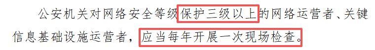 频次明确:要求网络安全等级保护三级以上的运营者、关键信息基础设施运营者“每年开展一次现场检查”,避免 “重突击、轻常态”;