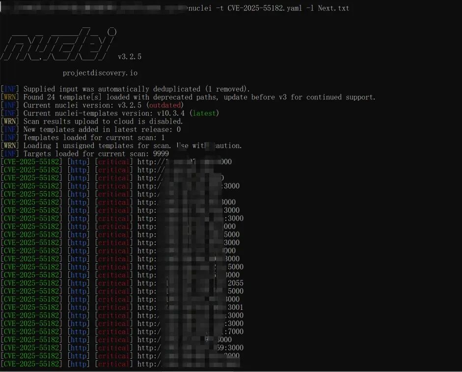 通过 Nuclei,我方构造并批量向目标地址发送特制 multipart/form‑data POST 请求,携带与 PoC 相同结构的恶意 payload,并设置 matcher 检测响应中的关键字段/跳转指示;若 matcher 命中,说明目标服务可能存在 RSC 远程代码执行漏洞 (CVE‑2025‑55182) 风险。为防止潜在利用,请相关业务单位 及时进行整改 —— 检查依赖版本、更新到已修复版本或移除受影响组件,并关闭或加固暴露的 Server‑side 接口。
