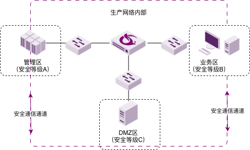 在生产网络内部,根据不同安全等级划分安全区域,在区域之间部署网关进行逻辑隔离和安全通信。