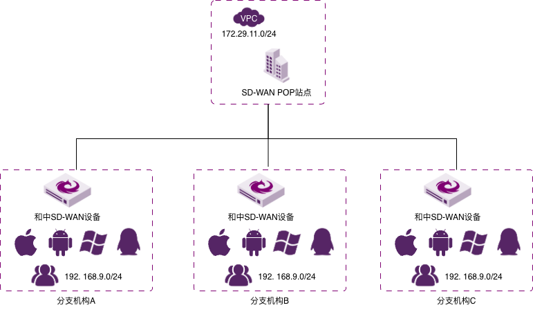 采用云POP网络架构,在公有云VPC,本地数据中心,分支机构间搭建虚拟专网,实现全网资源的互通,打造一张企业安全互联网络。