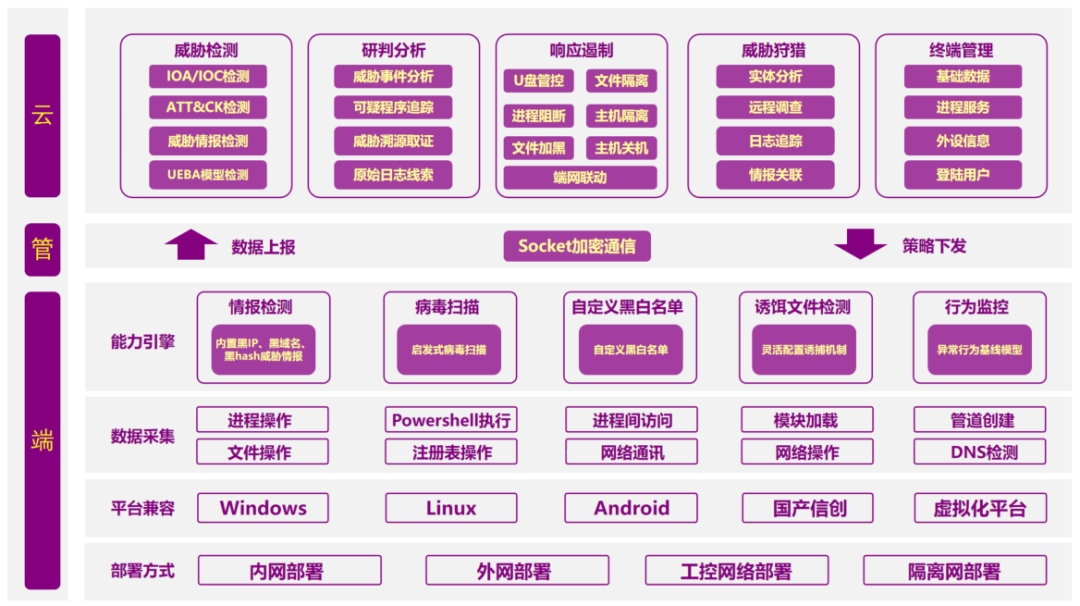 产品采用典型的C/S架构,管理后台负责接收终端Agent采集的数据并进行威胁分析研判、下达处置策略和指令,采集的数据在云端进行数据清洗、分析后,管理员可对威胁进行快速响应遏制,形成终端免疫效果,并下发到管理的终端,形成完整的事件处置闭环。