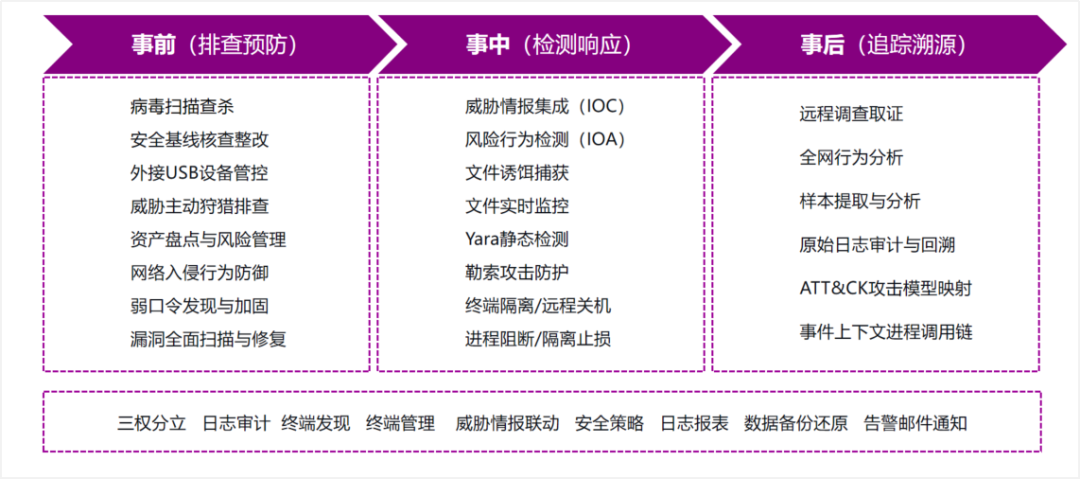 和中神雕终端威胁监测与响应系统通过集成多个安全检测和扫描引擎,形成强大的防护组合,全面覆盖安全防护的各个环节,无死角抵御各类威胁,确保在每个阶段都能及时发现并处理威胁。