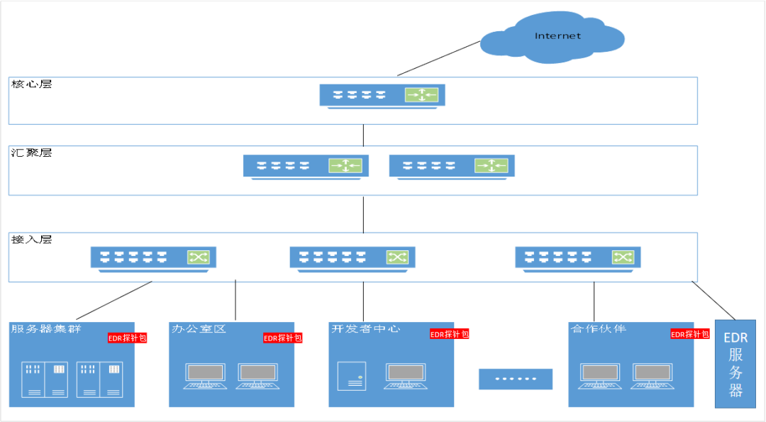 通过在企业内网各目标保护的服务器、办公设备、移动设备上部署轻量Agent,对进程调用、文件操作、注册表修改、网络连接等信息进行采集上报;agent还负责执行管理端下发的处置策略和终端任务。