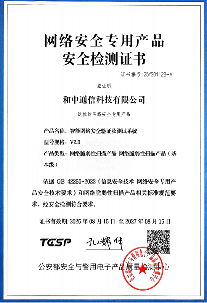 依据 GB 42250-2022《信息安全技术网络安全专用产品安全技术要求》、GB/T 20278-2022《信息安全技术网络脆弱性扫描产品安全技术要求和测试评价方法》、GB/T 25070-2019《信息安全技术网络安全等级保护安全设计技术要求》、GB/T 22239-2019《信息安全技术网络安全等级保护基本要求》以及相应产品类别对应的国家标准,和中战鹰智能网络安全验证及测试系统作为隶属于网专产品类目的网络脆弱性扫描产品,已顺利通过公安部安全与警用电子产品质量检测中心的严格安全检测。