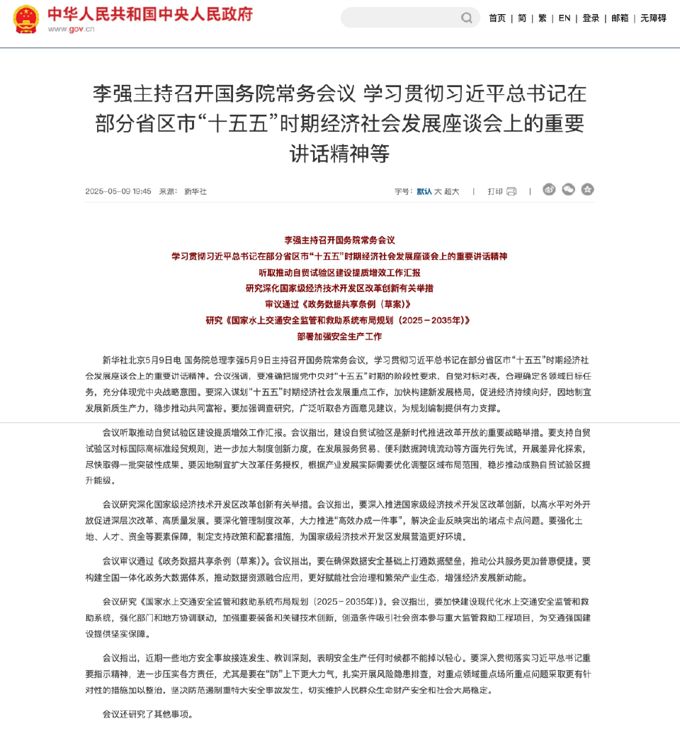 新华社北京5月9日电(记者 王雨萧)9日召开的国务院常务会议审议通过《政务数据共享条例(草案)》。