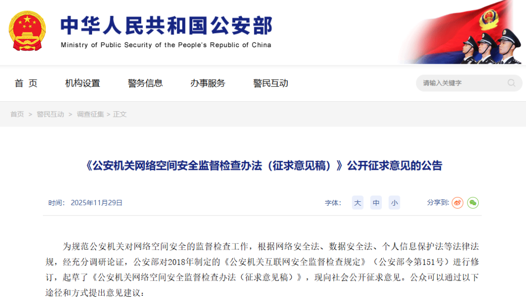 随着数字经济的深度发展,网络安全、数据安全与个人信息保护已成为国家安全体系的重要组成部分。为适应新形势下公安工作需要,公安部对2018年制定的《公安机关互联网安全监督检查规定》(公安部令第151号)进行修订,起草了《公安机关网络空间安全监督检查办法(征求意见稿)》,在监管范围、执行标准、责任界定等方面实现了全方位升级。公安机关网络空间安全监督检查办法,明确征求意见稿的核心变化,并为企业提供针对性的合规建议。