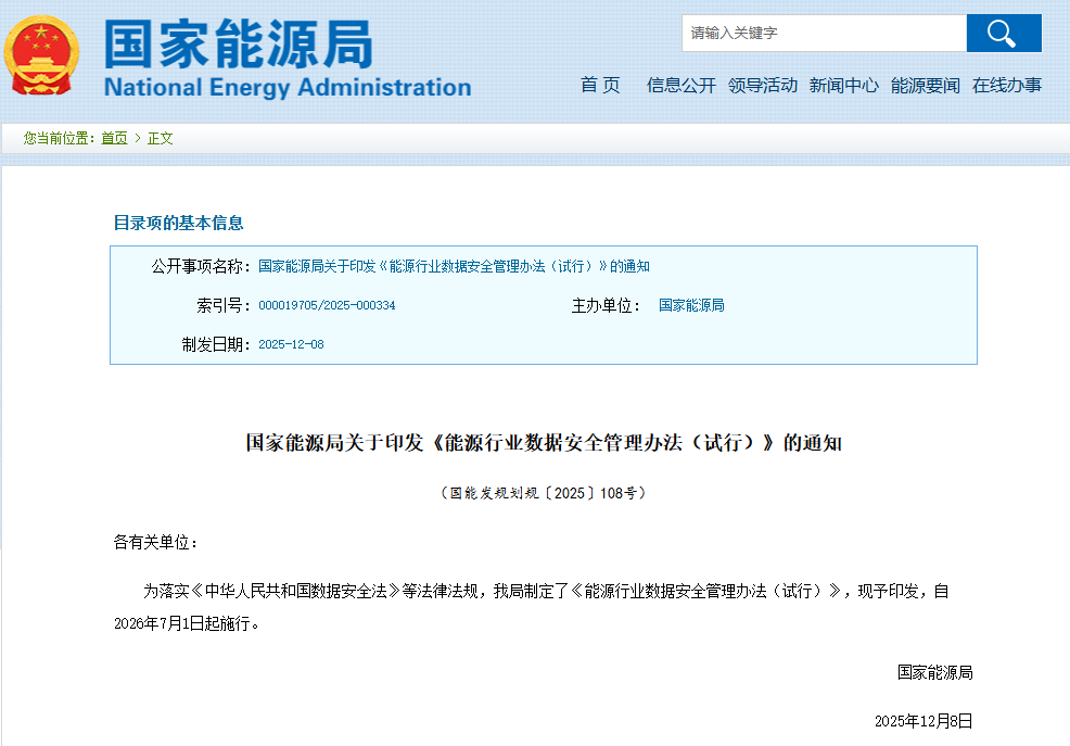 近日,国家能源局印发《能源行业数据安全管理办法(试行)》(以下简称《办法》),旨在规范能源行业数据处理活动,强化数据安全保护,促进数据合规开发利用。《办法》将于2026年7月1日起正式施行,有效期5年,为能源行业数据安全治理提供了全面、系统的制度遵循。