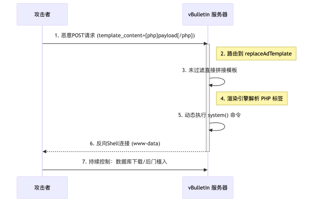 该漏洞的复现过程依赖于 vBulletin 中的模板渲染机制。攻击者通过构造一个特殊的POST 请求,目标路径为/ajax/api/ad/replaceAdTemplate 接口,该接口在处理传入参数template 时会对其内容进行解析并渲染,而渲染过程缺乏对危险表达式的安全限制。通过注入 标签,攻击者可以插入任意PHP 函数调用,如passthru()、system() 等,最终在服务端以Web 进程权限执行系统命令。