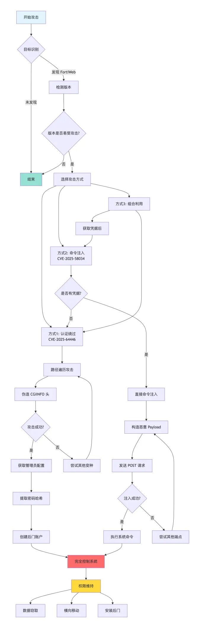 一、漏洞介绍FortiWeb 是 Fortinet 面向企业级 Web 应用防护的核心产品,用于执行应用层流量解析、策略匹配、虚拟补丁、访问控制等安全功能。在其管理功能中,部分模块需要处理管理员提交的配置参数并将其传递给底层系统组件执行。CVE-2025-64446 源于认证流程校验缺陷,攻击者可在特定路径下绕过登录验证访问受保护的管理接口;CVE-2025-58034 则因参数合法性校验不足,未过滤的输入被拼接进入系统命令执行链路,形成 OS 命令注入。两者联用可构成完整攻击链:先绕过身份验证,再通过恶意参数执行高权限命令,从而直接控制 FortiWeb 设备。Fortinet 已发布补丁,通过强化认证逻辑与严格输入校验完成修复。通过构造恶意参数即可触发命令注入,从而在 FortiWeb 设备上执行任意系统命令。由于 FortiWeb 基于专有系统运行(FortiOS 派生),设备执行的命令具有较高权限,因此漏洞一旦被利用,将直接影响设备自身的配置安全与运行完整性。二、漏洞影响该组合漏洞对 FortiWeb 设备构成严重安全风险。其中 CVE-2025-64446 可使攻击者在无需有效凭据的情况下绕过登录验证,直接访问管理接口;随后利用 CVE-2025-58034 的命令注入缺陷,通过恶意参数执行高权限系统命令。