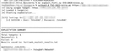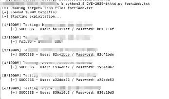 利用自动化脚本对外网暴露的 FortiWeb 资产进行了认证流程校验与漏洞触发验证,结果显示部分目标能够被成功绕过身份认证并进入后台验证逻辑,具备被进一步利用的风险。此次复现已确认漏洞在多处真实设备上可被重复触发,说明相关暴露面当前处于可被攻击者批量扫描和利用的状态,建议相关单位立即排查自身资产、限制外网暴露并完成版本加固与安全修复,以避免被恶意利用。