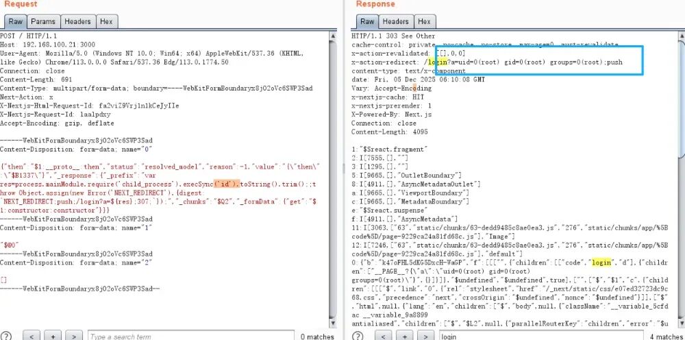 攻击者首先构造一个特制的 HTTP POST 请求,使用 multipart/form-data 格式,将 RSC (React Server Components) “Server Action / Server Function” 所期望的 payload 包装在请求体内。这个 payload 利用不安全的反序列化机制 (unsafe deserialization) + JavaScript 原型链 (prototype) 操控,将 __proto__ 或构造函数 (constructor) 注入到反序列化对象中,从而绕过安全边界。在解析过程中,服务端将恶意内容当作合法对象处理,并执行其中包含的命令 — 比如通过 child_process.execSync 执行系统命令。这样,攻击者便能在服务器上执行任意代码 (RCE),无须认证即可触发。如果目标系统运行受影响版本 (如 react-server-dom-webpack / RSC DOM 包 + 使用 RSC 的 Next.js 等),且暴露了 RSC Server-side 接口,就可能被利用。整个过程核心在于“服务端对客户端输入的数据反序列化时缺乏校验 + 允许注入构造函数/原型污染 + Node.js 环境可执行命令”。
