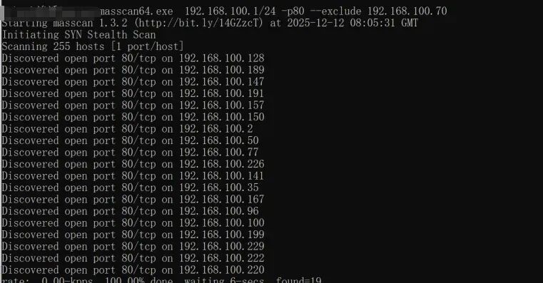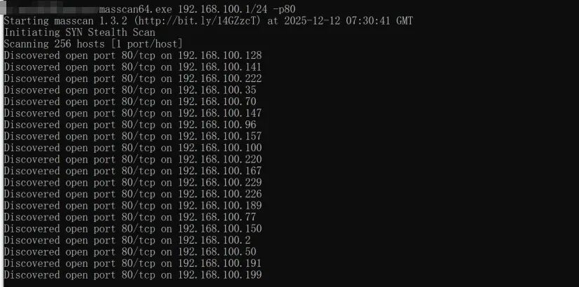masscan 192.168.100.1/24 -p80