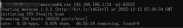 四、MASSCAN总结MASSCAN 作为一款极高速端口扫描器,不仅支持常见的单端口、多端口、全端口以及文件批量扫描,还可以通过 --rate 灵活控制发包速率,确保在不同网络环境中安全、可控地运行。除了基础扫描功能外,MASSCAN 还提供了丰富的结果输出能力,可将扫描结果以 JSON、XML、nmap 等格式保存到本地文件,方便后续与 nmap、指纹识别工具或企业资产管理系统进行联动分析。同时还支持排除特定 IP、跳过敏感网段、多网卡并发等高级能力,使其不仅适用于轻量级探测,也能胜任大规模资产测绘与自动化安全巡检,是安全从业者必备的高效扫描组件。