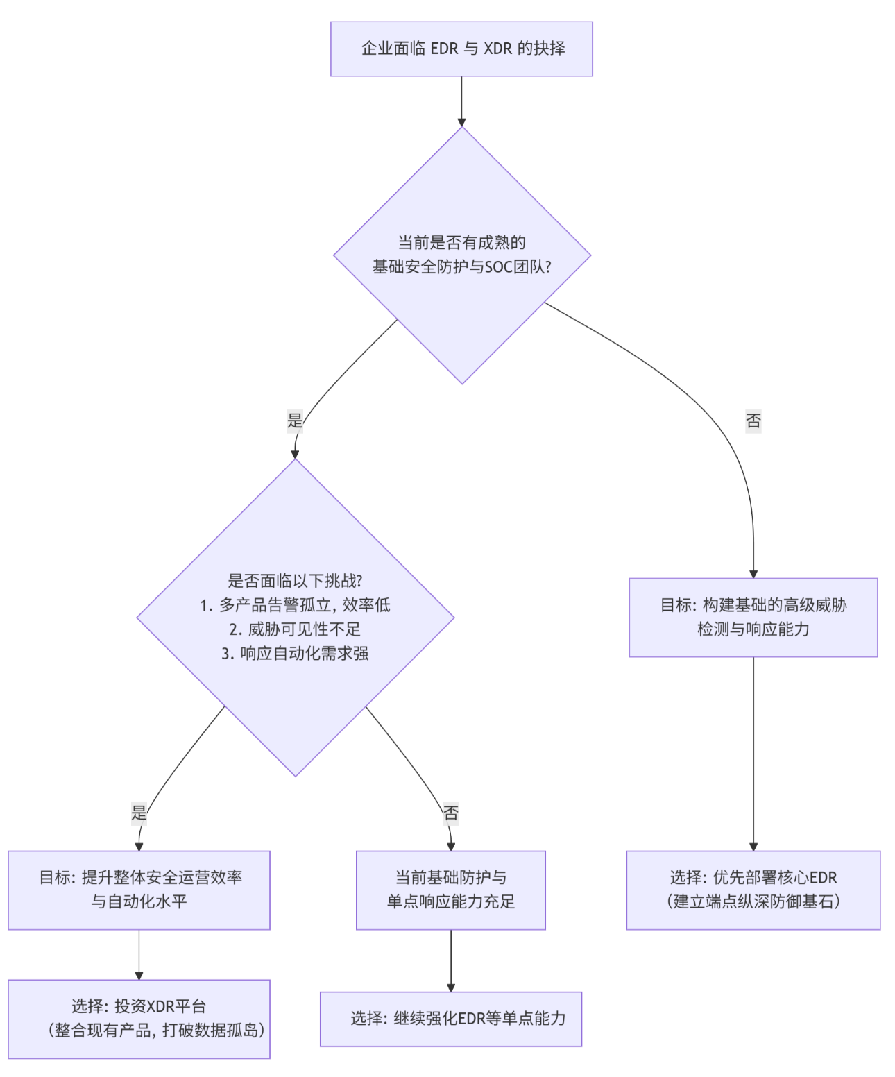 选择EDR还是XDR,不是一个简单的“谁更好”的问题,而是一个“现阶段谁更合适”和“未来如何演进”的问题。您可以从下图的决策路径获得清晰指引: